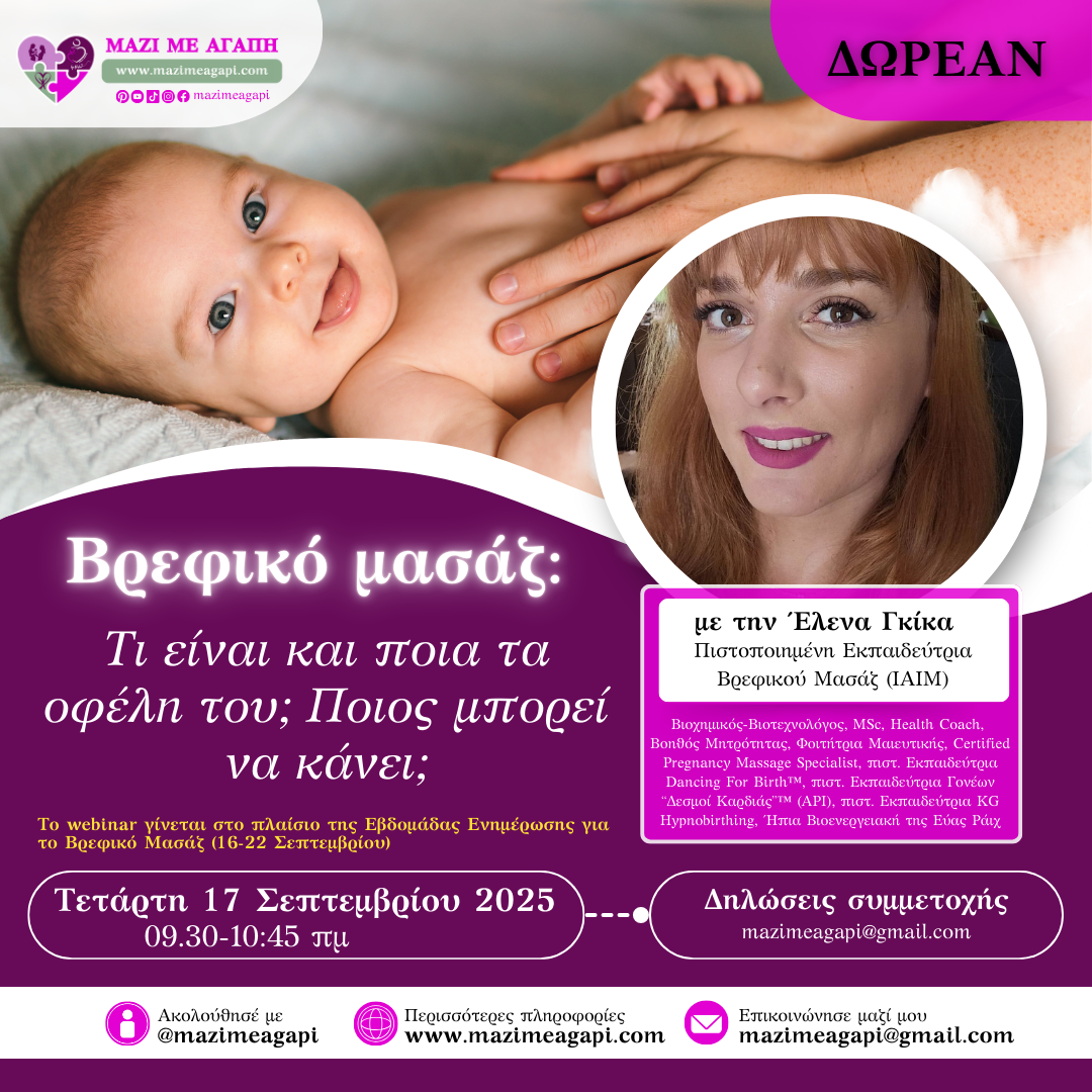Ανακάλυψε τη μαγεία του Βρεφικού Μασάζ "Μαζί με Αγάπη" Είσαι νέος γονιός ή περιμένεις το μωρό σου; Θέλεις να δημιουργήσεις έναν ακόμα πιο δυνατό δεσμό με το μωρό σου, ενώ παράλληλα του προσφέρεις χαλάρωση, ασφάλεια και ευεξία;