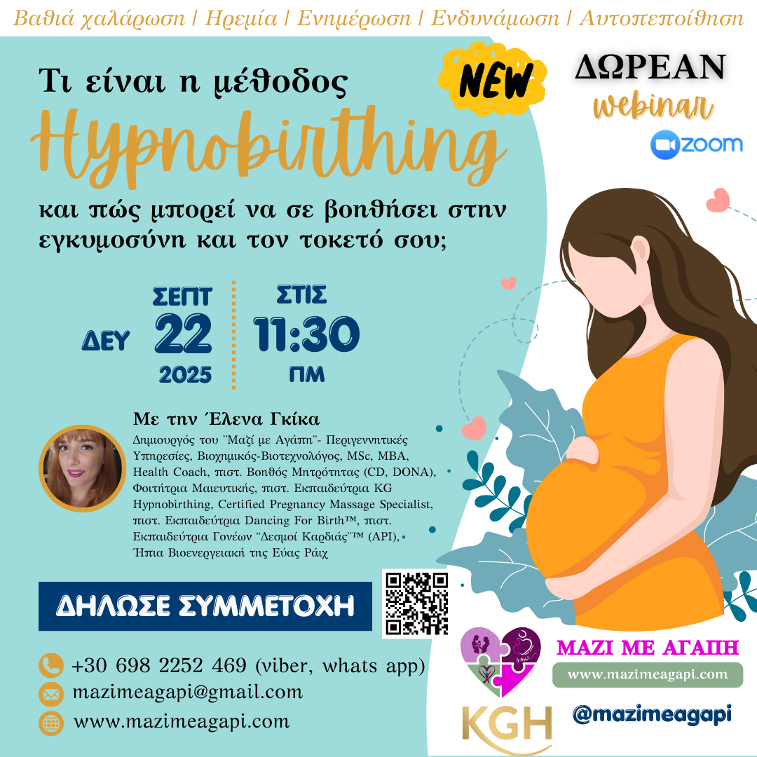 Ίσως έχεις ήδη ακούσει τον όρο hypnobirthing, αλλά δεν είσαι σίγουρη τι ακριβώς είναι; Ή μήπως αναρωτιέσαι αν θα μπορούσε να σε βοηθήσει να γεννήσεις με περισσότερη ηρεμία, εμπιστοσύνη και λιγότερο φόβο; Σου ετοίμασα ένα δωρεάν webinar που θα σου λύσει όλες τις απορίες!