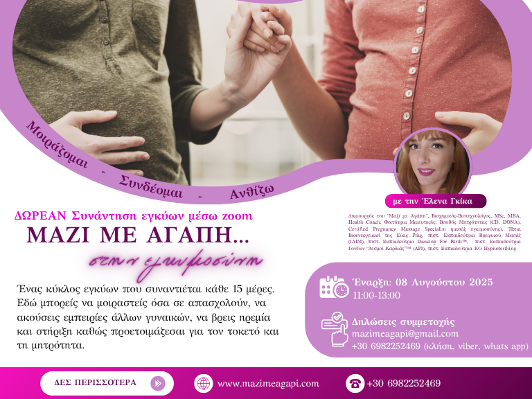 Η εγκυμοσύνη είναι ένα μοναδικό ταξίδι, γεμάτο χαρές, απορίες, προσμονή, αλλά και στιγμές ανασφάλειας. Κάθε γυναίκα κουβαλάει τις δικές της σκέψεις, τα δικά της συναισθήματα, τις δικές της εμπειρίες. Και όλες αξίζουμε έναν χώρο όπου μπορούμε να τα μοιραστούμε. Δες περισσότερα για το περιεχόμενο και τον σκοπό των Συναντήσεων Εγκύων “Μαζί με Αγάπη…στην εγκυμοσύνη” και δήλωσε συμμετοχή να γίνεις κι εσύ μέρος αυτής της παρέας.